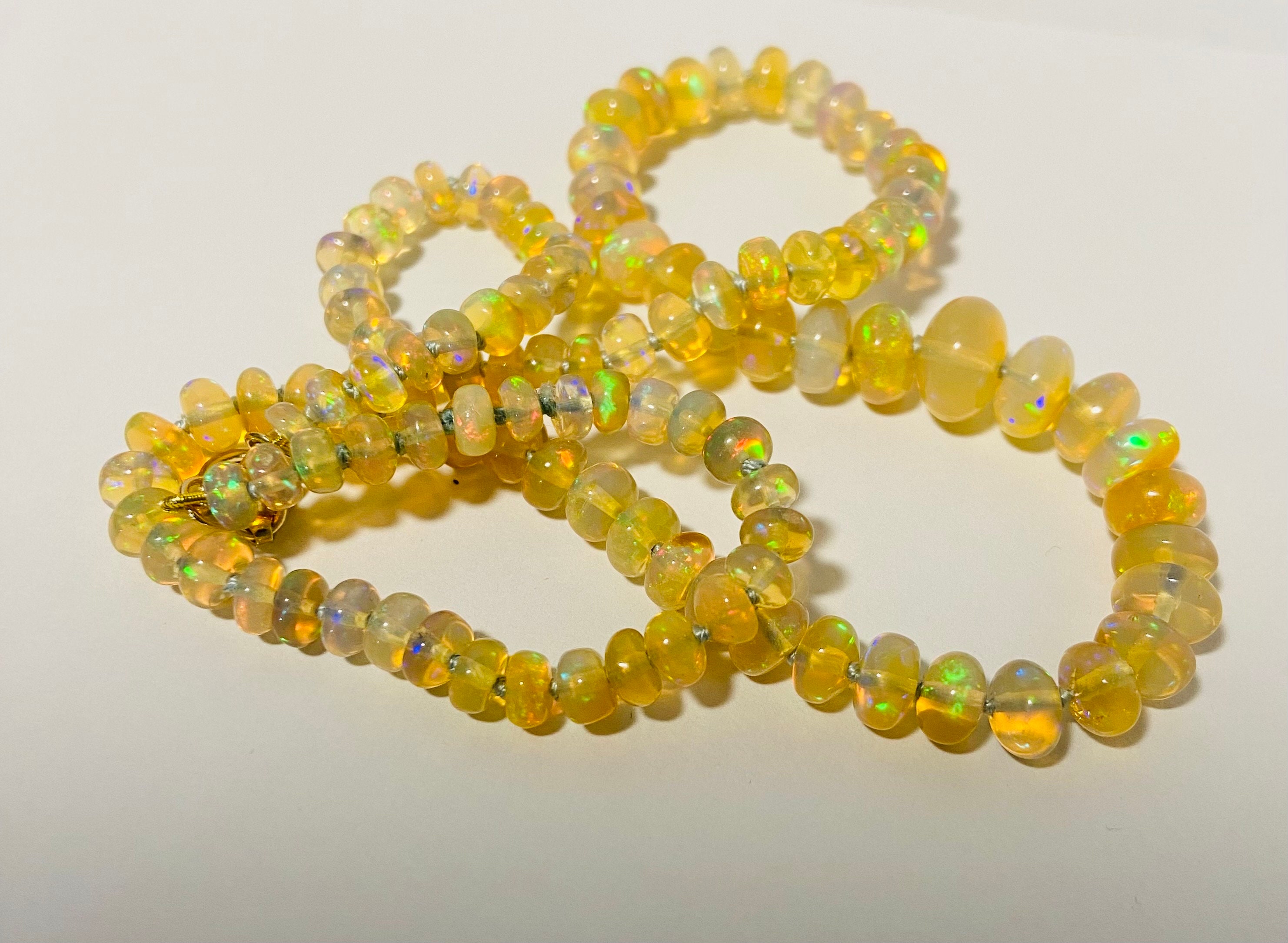 Rare Golden Ethiopian Opal beaded necklace with 14k lobster clasp on hand knotted silk string. Opal beads are graduated from 4mm to 7mm. Necklace length 18 inches. Handmade, please allow time for workmanship and mail delivery. Due to the nature and handmade item no piece will be the same. Please message seller if you want multiples. great gifts for loved ones, gifts for mom, gifts for her