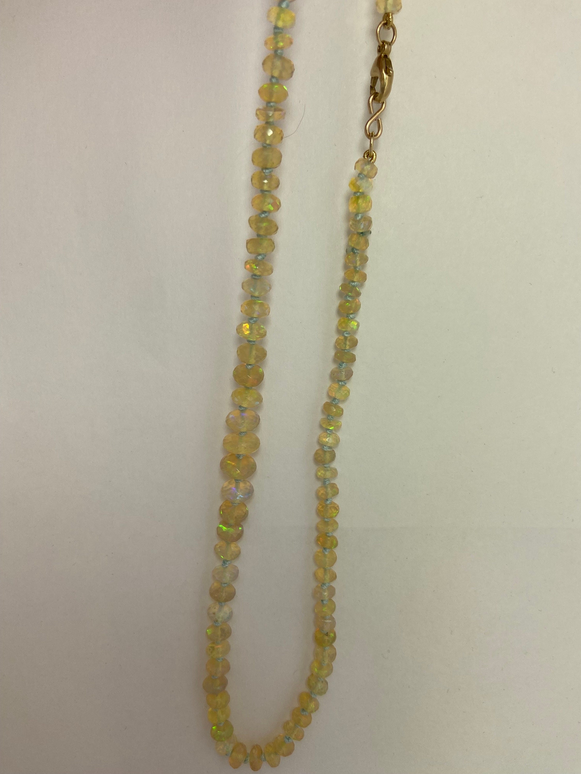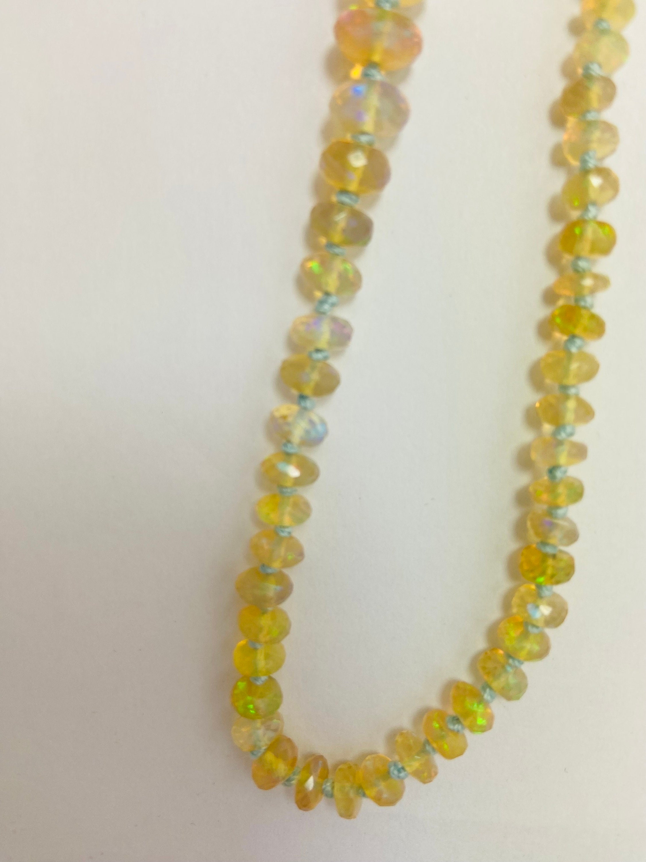 Rare Faceted Golden Ethiopian Opal beaded necklace with 14k lobster clasp on hand knotted silk string. Opal beads are graduated from 4mm to 7mm. Necklace length 18 inches. Handmade, please allow time for workmanship and mail delivery. Due to the nature and handmade item no piece will be the same. Please message seller if you want multiples.