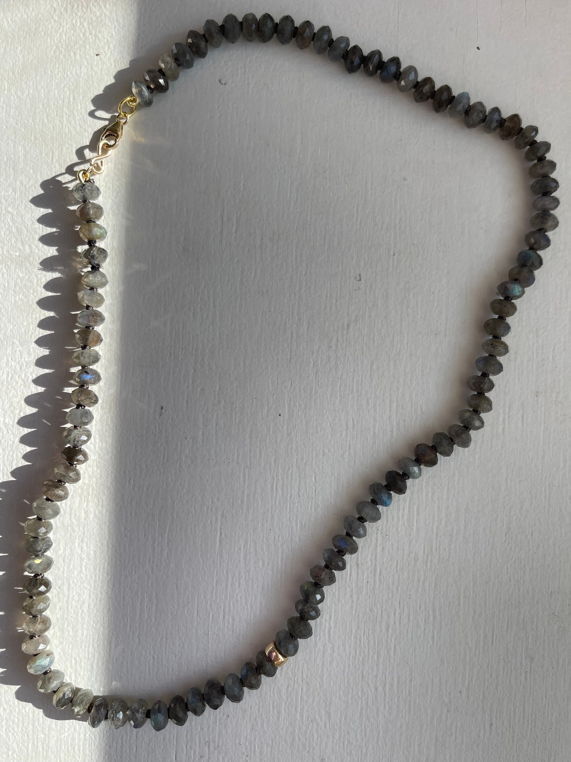 Beautiful Handmade Beaded Labradorite necklace on silk cord with a 12mm solid gold lobster clasp closure. The necklace is 18in length, bead size is 6mm, dark gray silk string cord was used for an elegant look. Every necklace is handmade please allow time for workmanship and mail delivery on holidays can take long. Due to the nature of the beads and handmade item no piece will be the same. Prefect gifts for mom or your favorite loved one in your life.