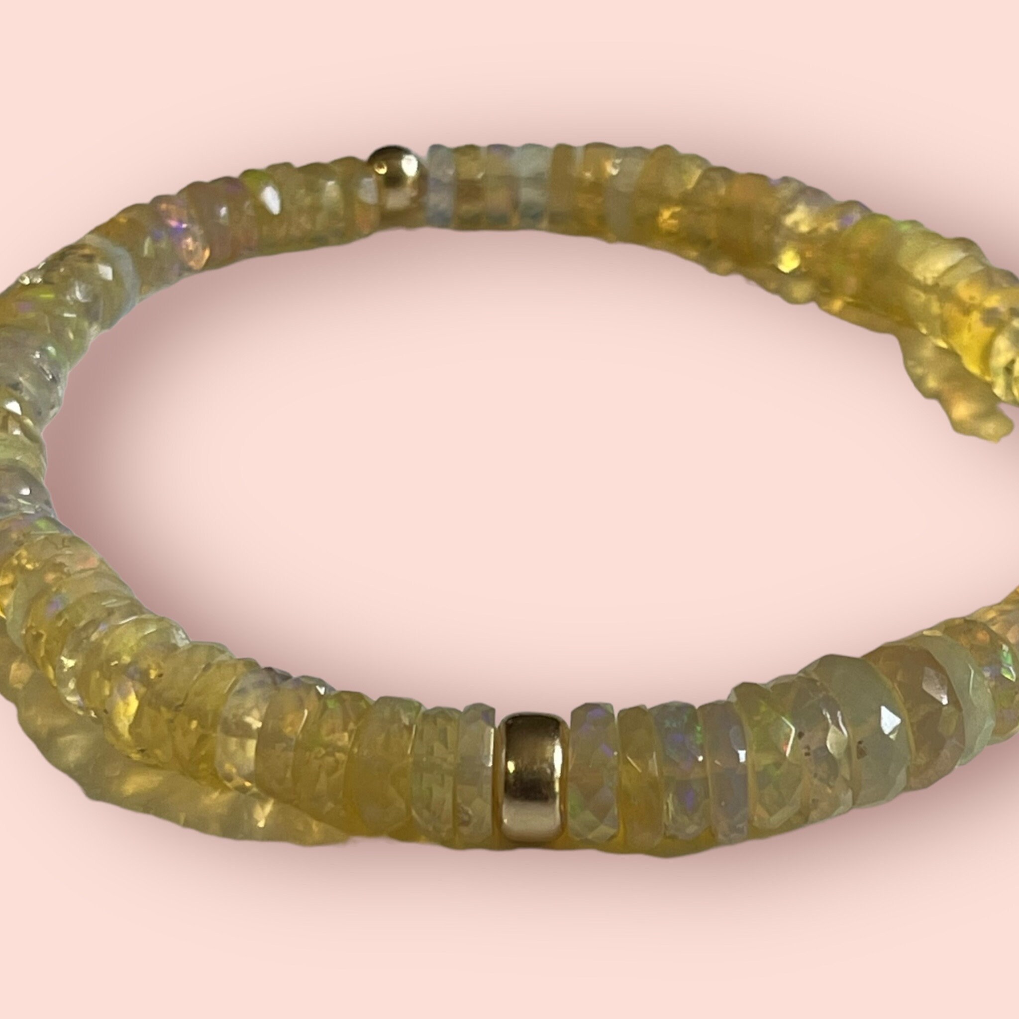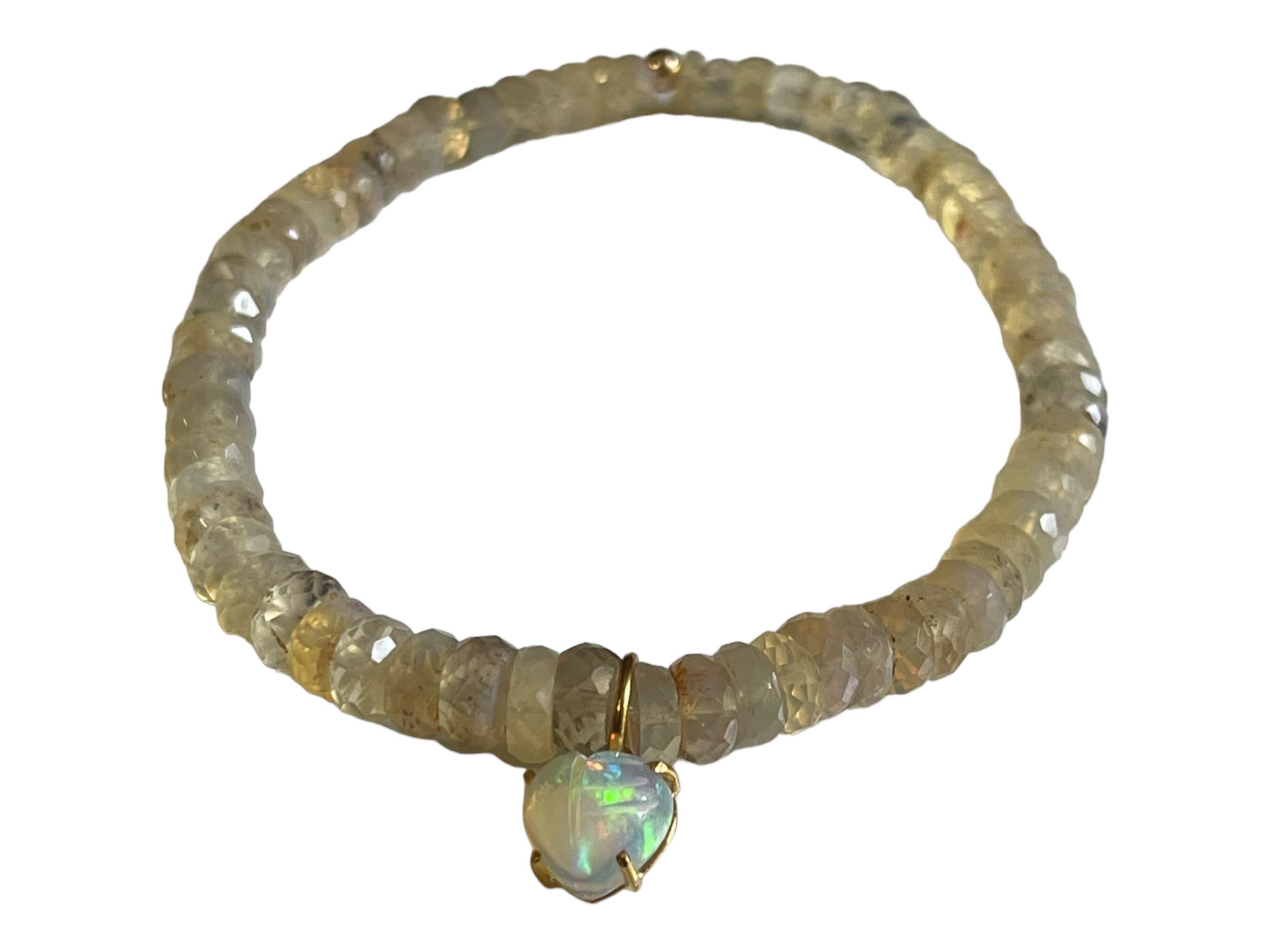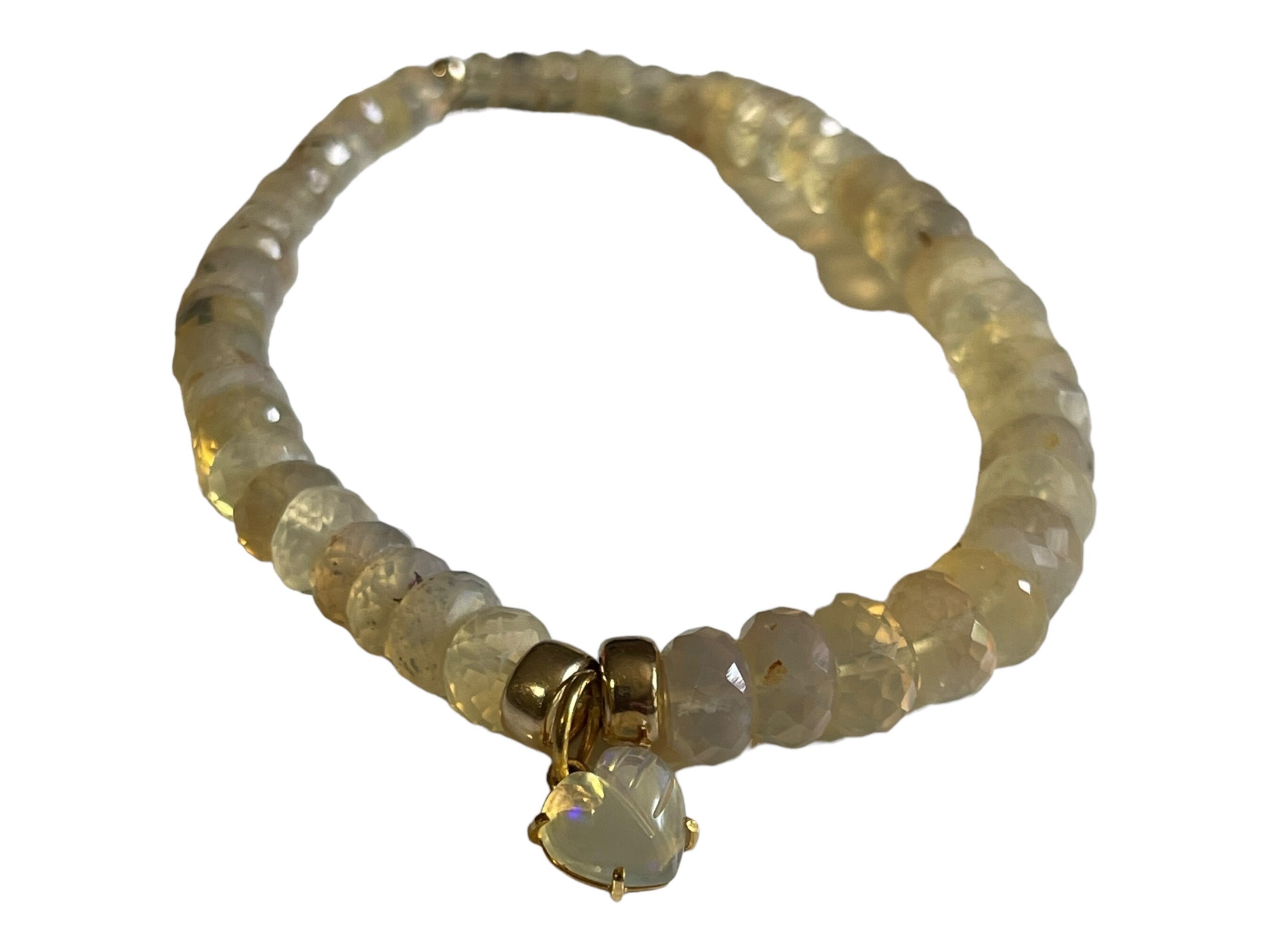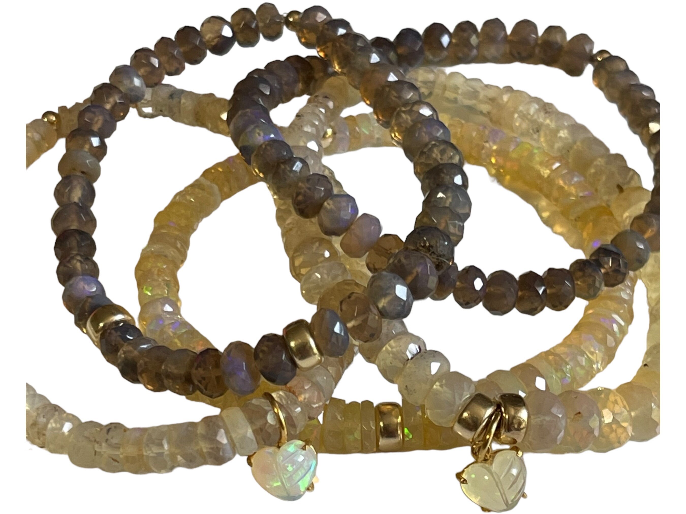 These fantastic opals stretchy bracelets are one of a kind. You can choose either, Australian Crystal Opal, Ethiopian Opal or Lavendar Australian Opal. Two Crystal opal bracelets graduated from 5mm to 8mm beads both have solid gold opal heart charms and one with additional solid gold rondel on each side. One Ethiopian Opal available comes with a solid gold rondel graduated from 5mm to 8mm beads. Two available Lavendar Australian Opal 6 mm beads one has two 14kt solid rondel on each side.