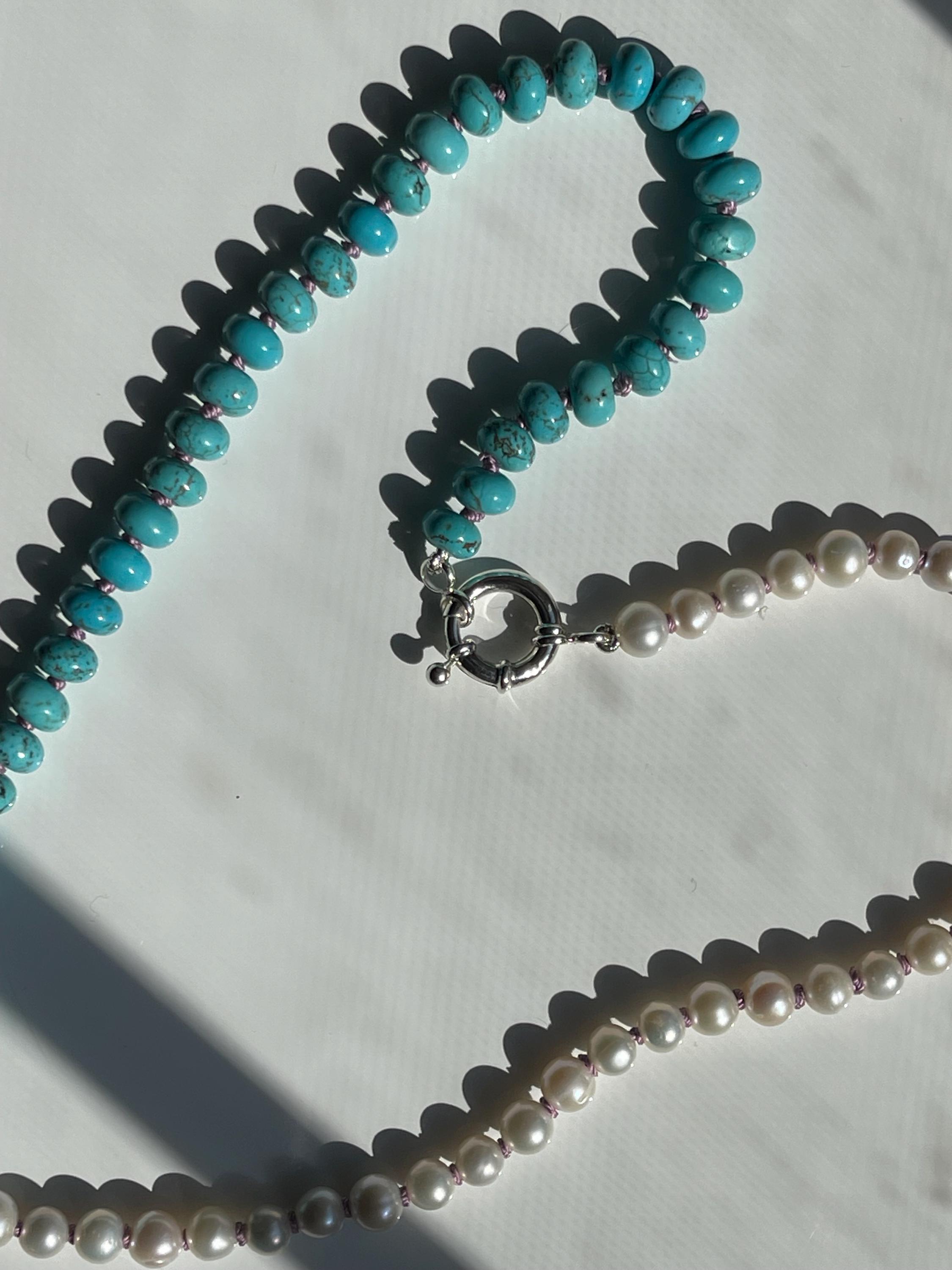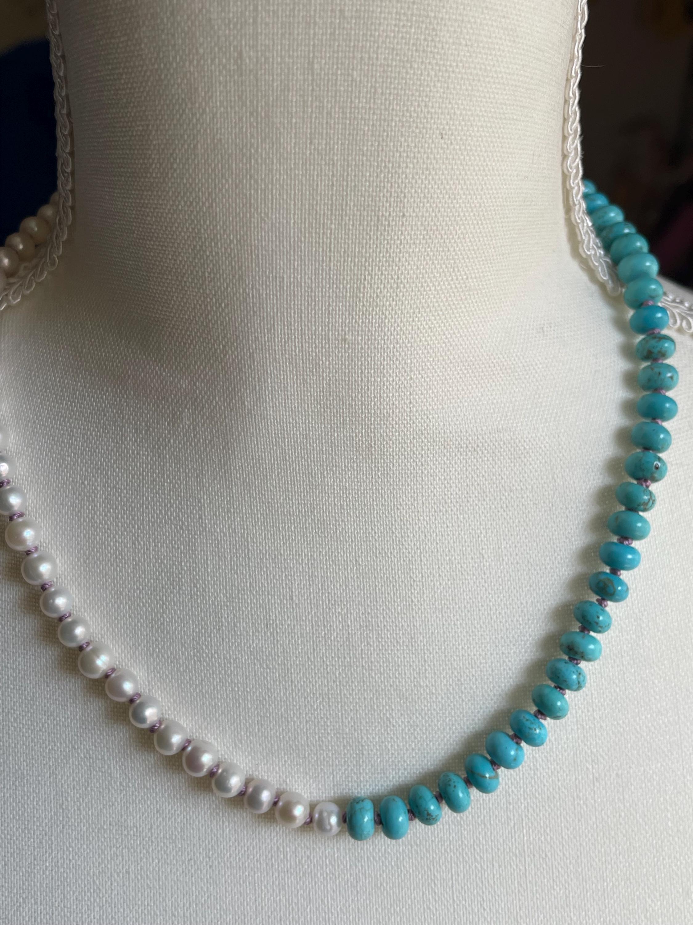 Hand knotted Kingsman Turquoise and Pearl necklace on silk gifts for her, birthday gemstone