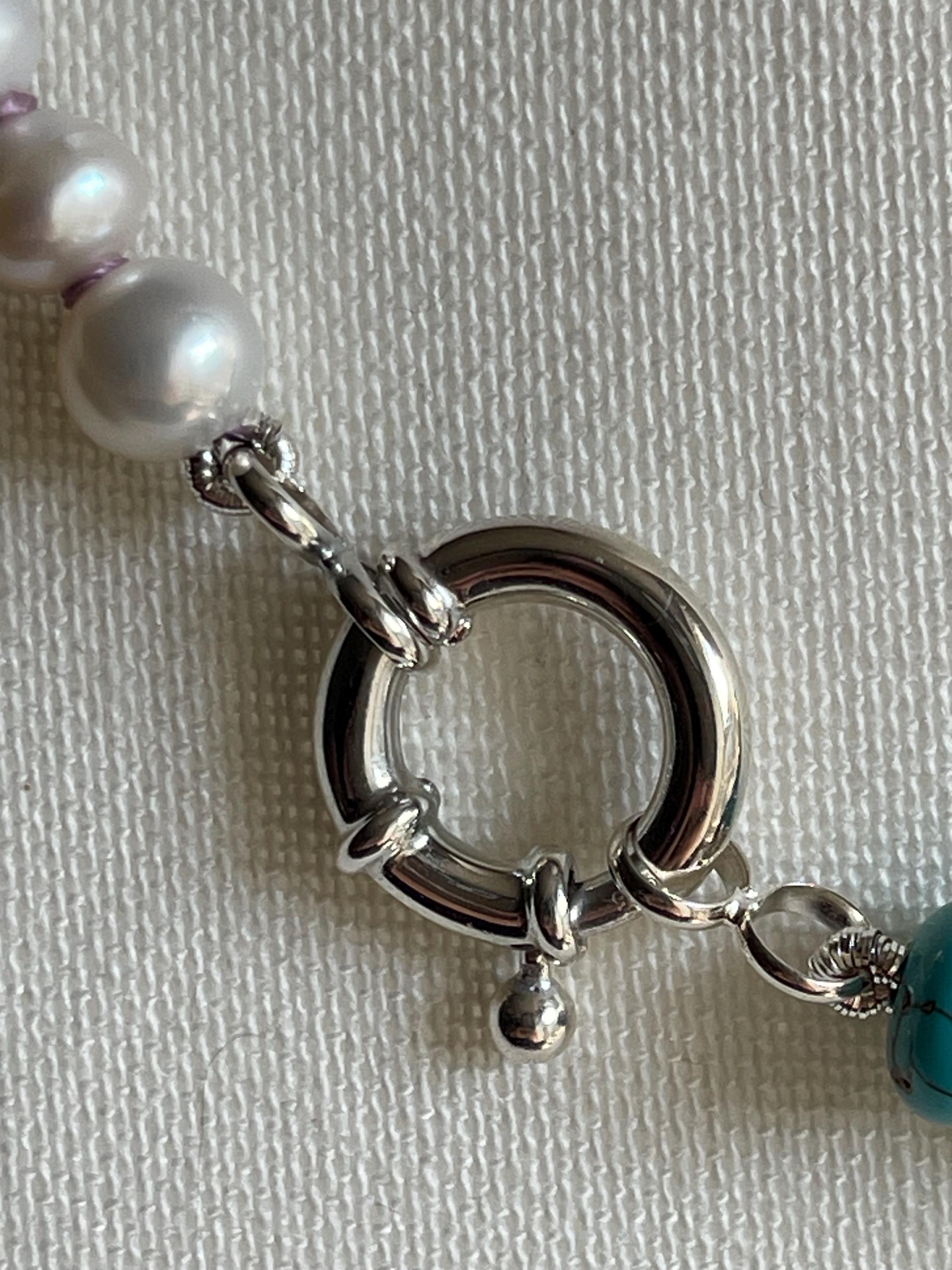 Beautiful hand knotted beaded Kingsman Turquoise and Pearl on lilac silk string. Comes with a Sterling silver connector where you can hang all your charms. Bead size 8mm. Necklace length 18 inches. Gifts for her, birthday gemstone, gifts for mom, birthday gifts.
